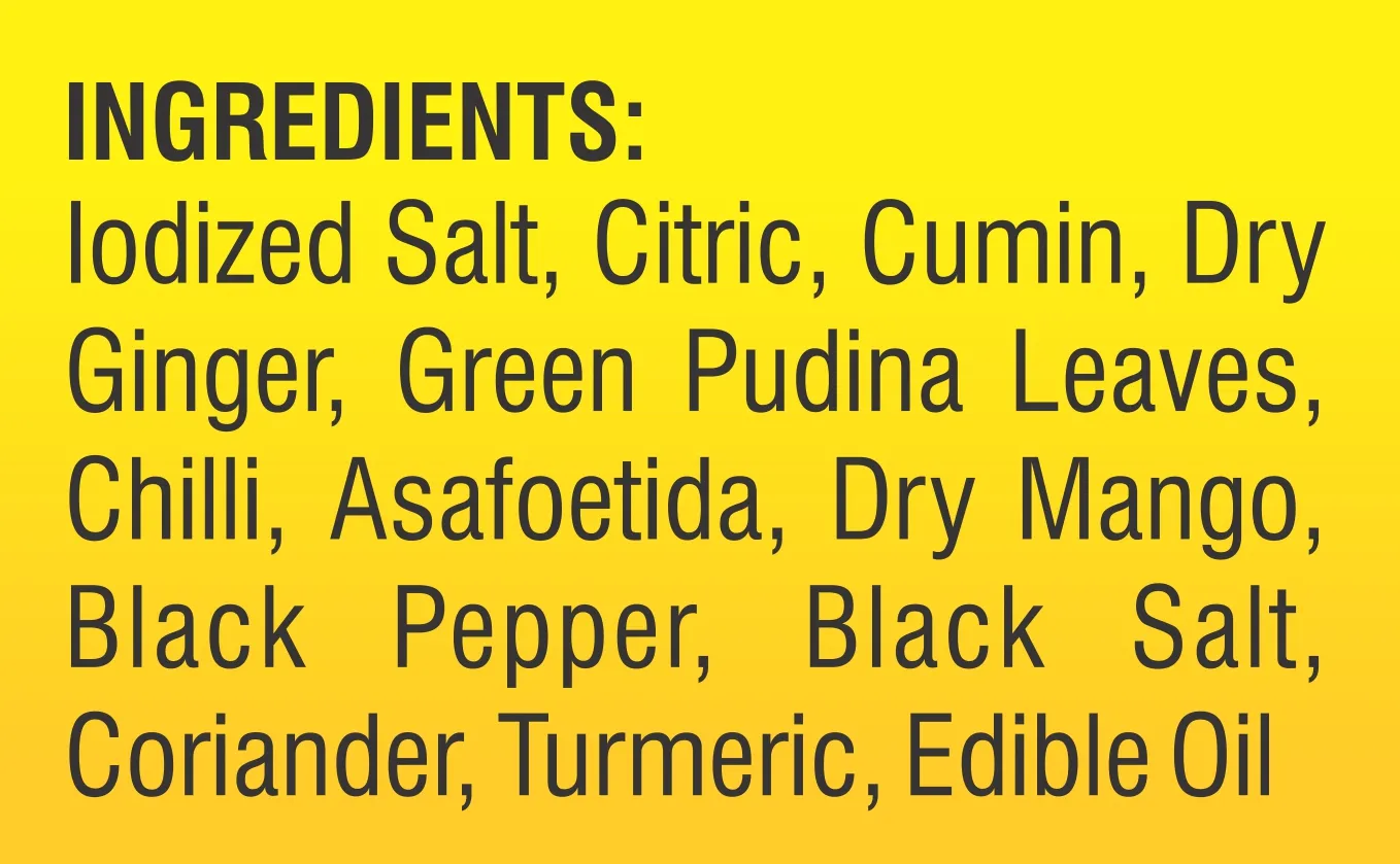 Ingredients: (In Powder Form) Blends Lodized Salt, Citric, Cumin, Dry Ginger, Green Pudina Leaves, Chilli, Asafoetida, Dry Mango, Black Pepper, Black Salt, Coriander, Turmeric, Edible Oil No Artificial Colour And Flavour Used.
