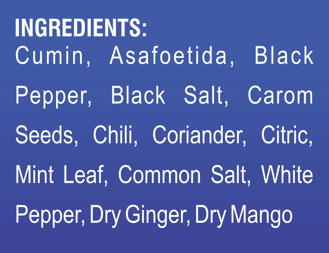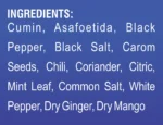 Ingredients: (In Powder Form) Blends Cumin, Asafoetida, Black Pepper, Black Salt, Carom Seeds, Chili, Coriander, Citric, Mint Leaf, Common Salt, White Pepper, Dry Ginger, Dry Mango