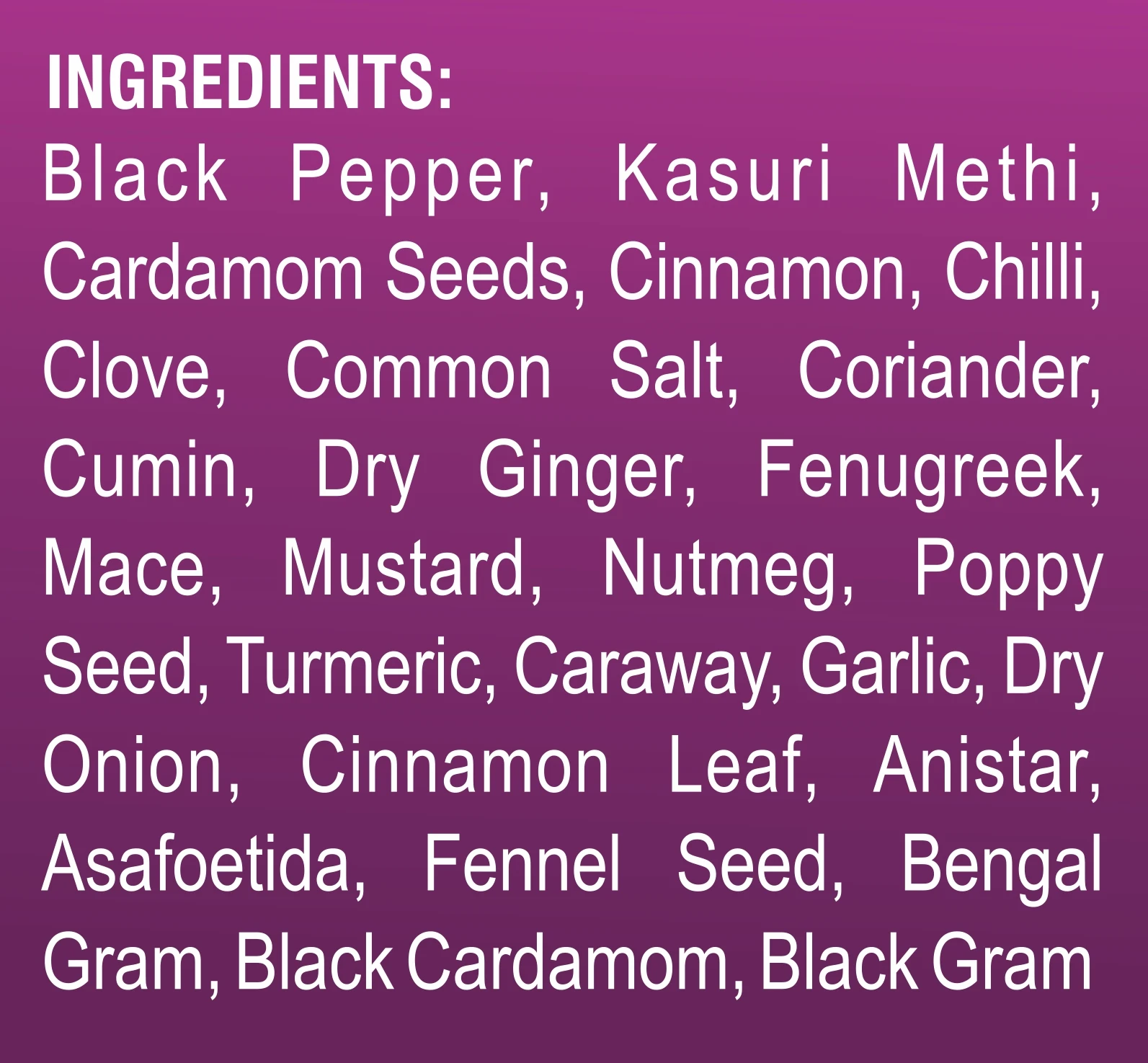 Ingredients: (In Powder Form) Blends Black Pepper, Kasuri Methi, Cardamom Seeds, Cinnamon, Chilli, Clove, Common Salt, Coriander, Cumin, Dry Ginger, Fenugreek, Mace, Mustard, Nutmeg, Poppy Seed.