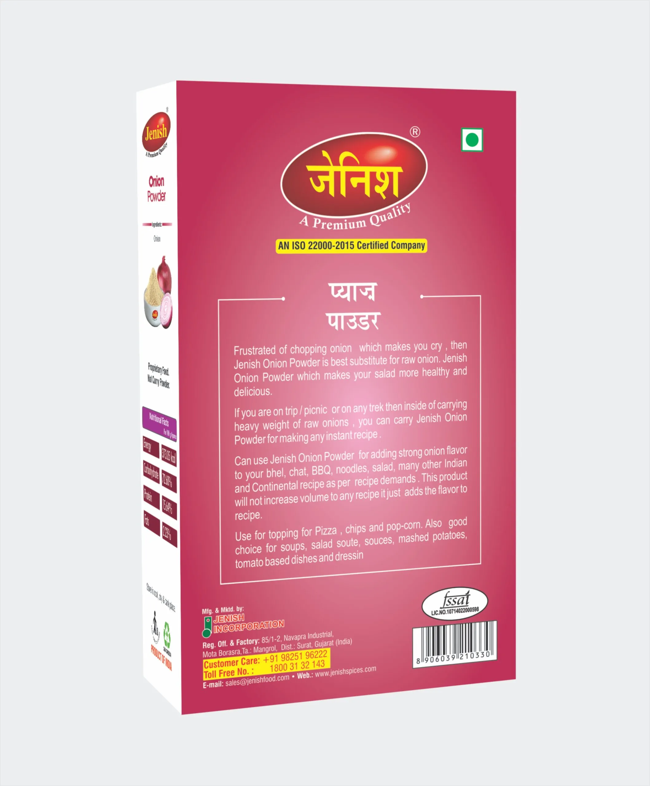- Jenish Onion Powder perfectly blends into recipes having quite versatile culinary usage, with onions being a beloved flavor for various cuisines and savory richness to dishes of all kinds which accentuates your cooking experience for sure