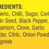 Ingredients: (In Powder Form) Turmeric, Chillies (Kashmiri), Sugar, Coriander, Cumin Seed, Black Pepper, Citric, Cardamon, Clove, Garlic Powder, Onion Powder, Fenugreek