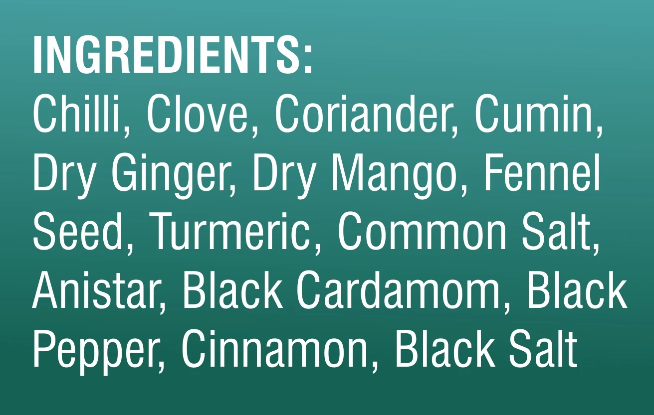 Ingredients: (In Powder Form) Chilli, Clove, Coriander, Cumin, Dry Ginger, Dry Mango, Fennel Seed, Turmeric, Common Salt, Anistar, Black Cardamom, Black Pepper, Cinnamon