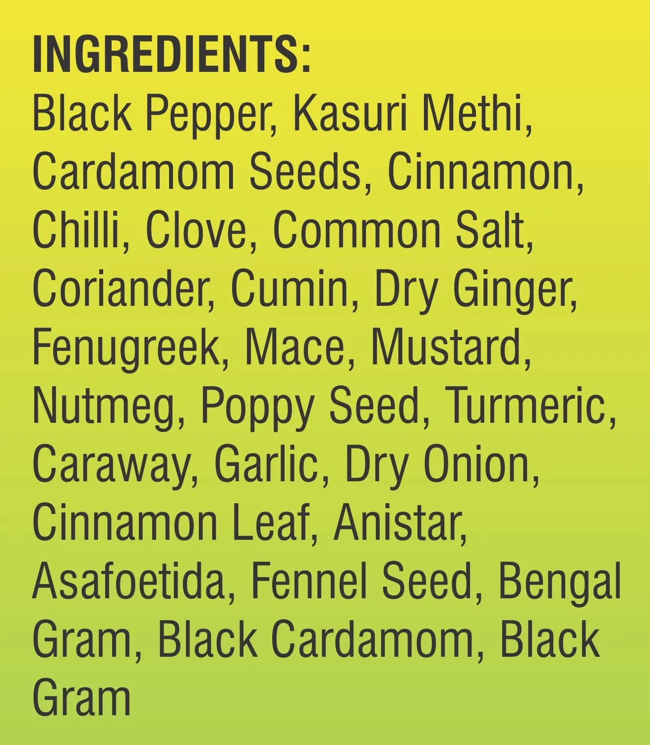 Ingredients: (In Powder Form) Black Pepper, Kasuri Methi. Cardamom Seeds, Cinnamon, Chilli, Clove, Common Salt, Coriander, Cumin, Dry Ginger, Fenugreek, Mace, Mustard, Nutmeg, Poppy Seed.